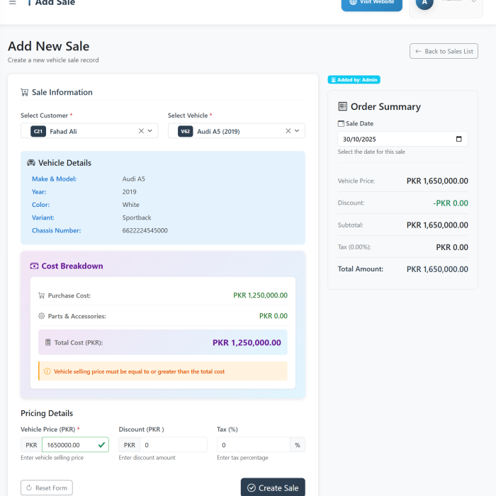 Track any parts or accessories purchased for your vehicles before sale. These costs automatically merge into the total vehicle cost, helping you maintain accurate profit margins.