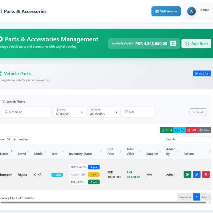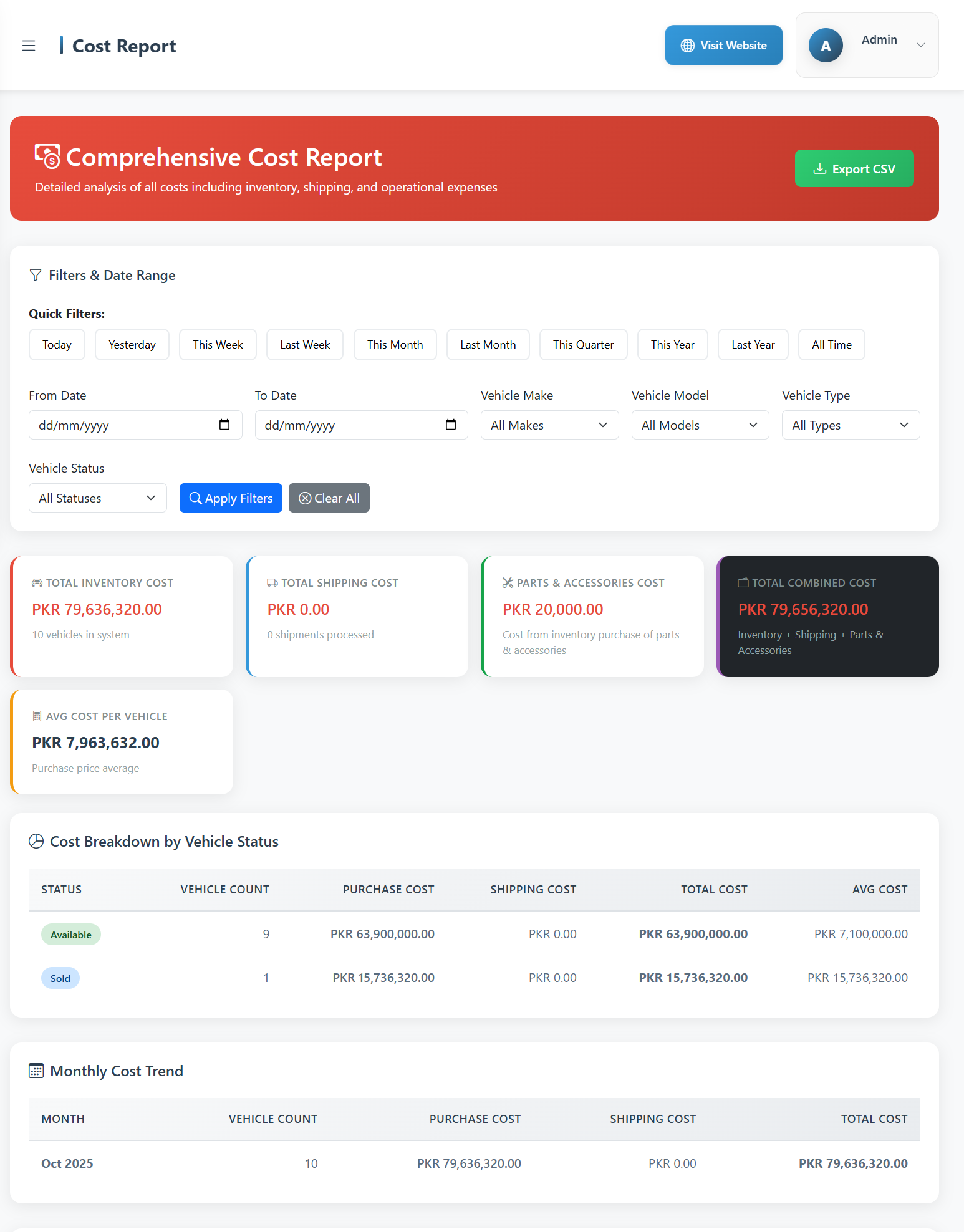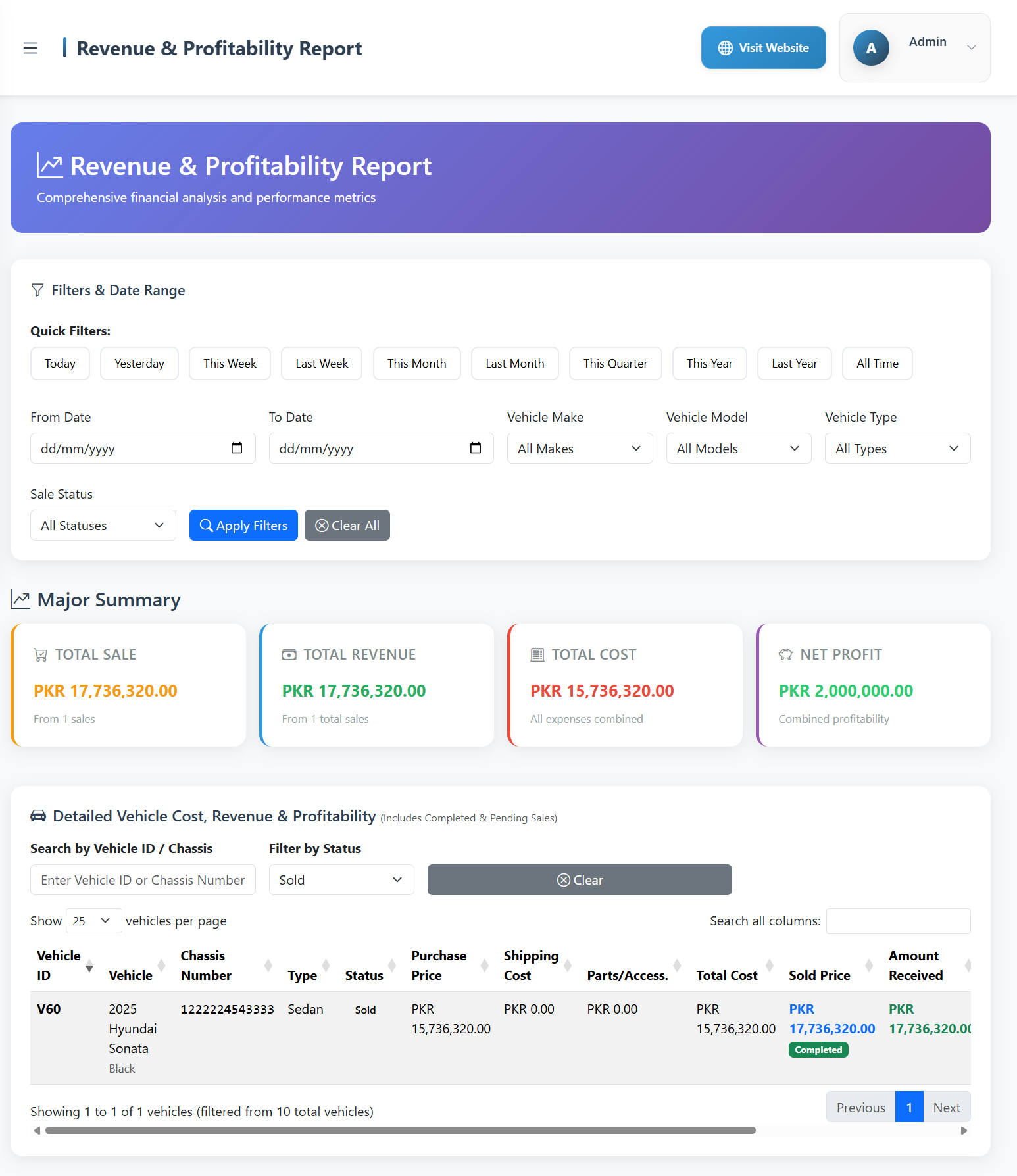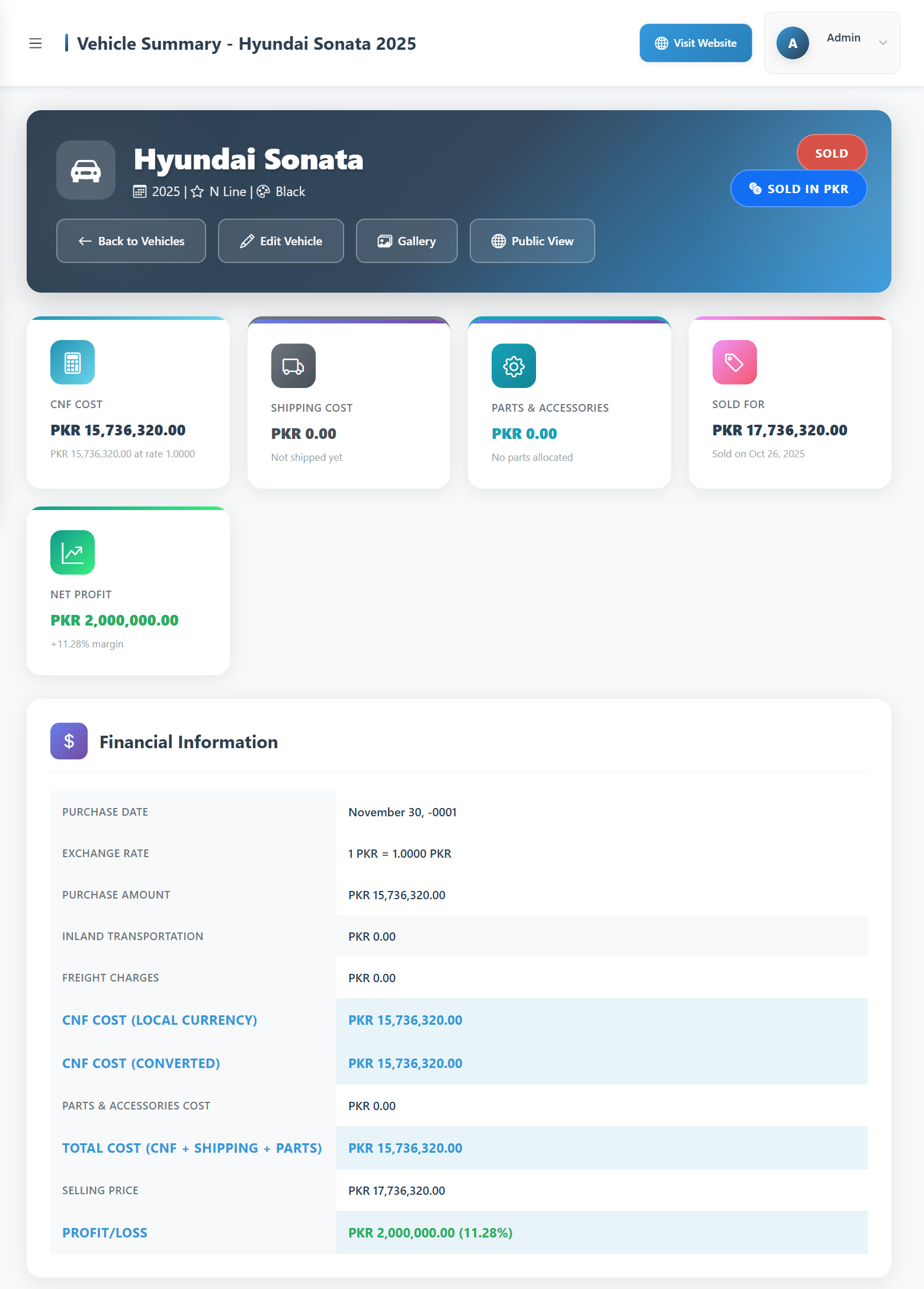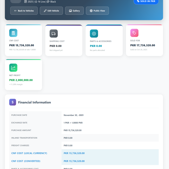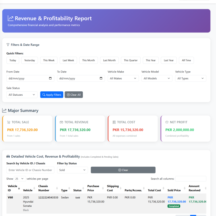 Easily manage your entire vehicle inventory โ from purchasing to sale. Store details like make, model, color, engine number, purchase price, and selling price. Each vehicle is linked with all related costs, ensuring transparent profit tracking.