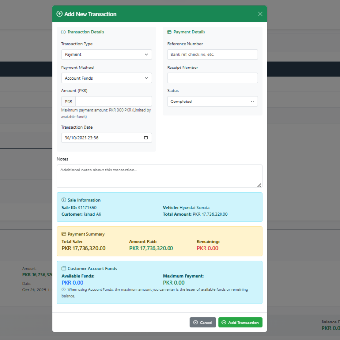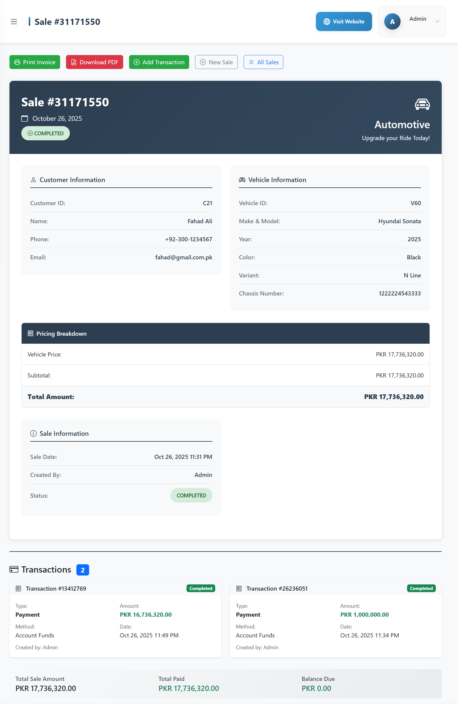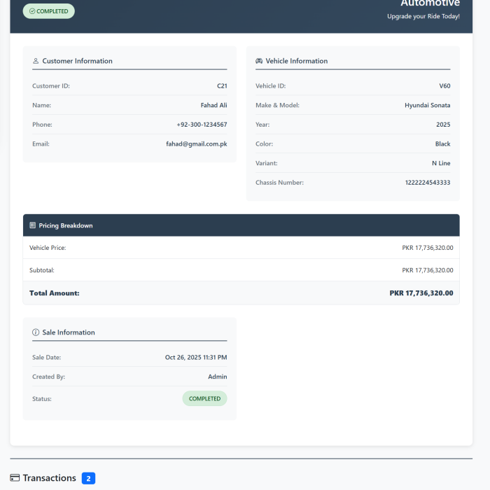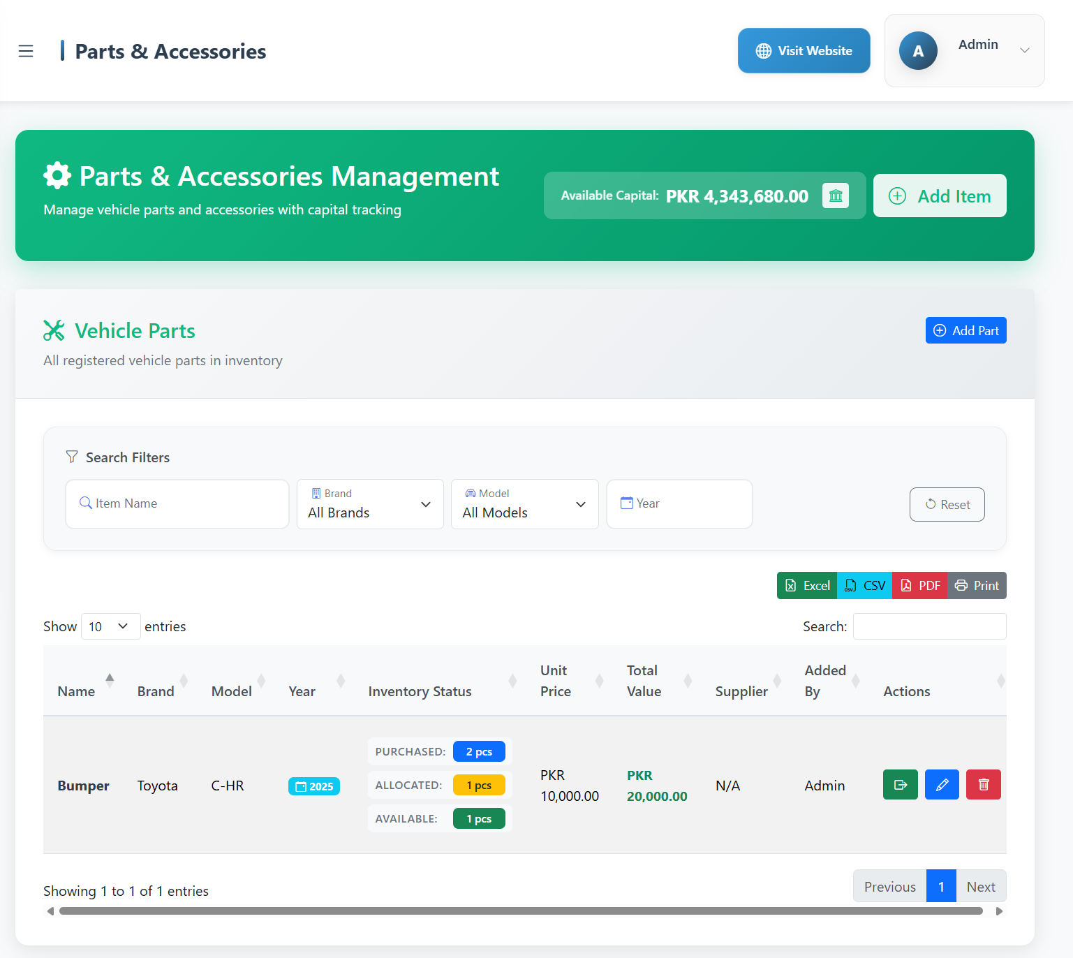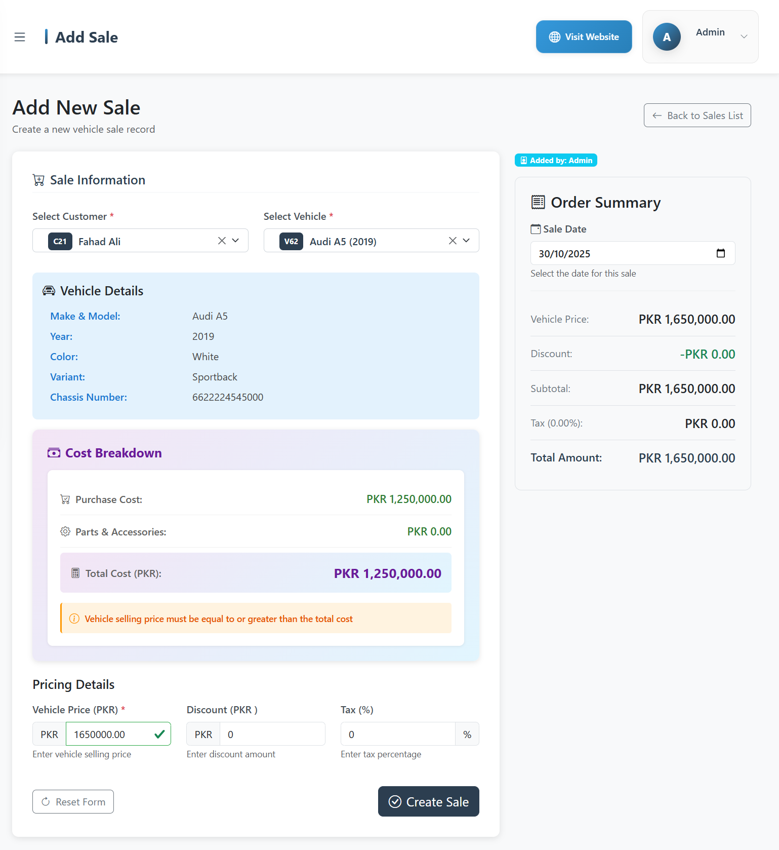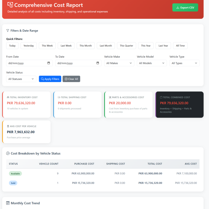 Easily manage your entire vehicle inventory โ from purchasing to sale. Store details like make, model, color, engine number, purchase price, and selling price. Each vehicle is linked with all related costs, ensuring transparent profit tracking.