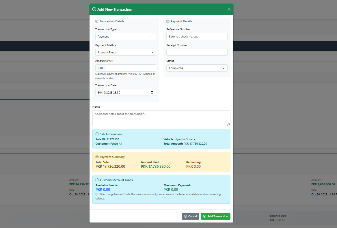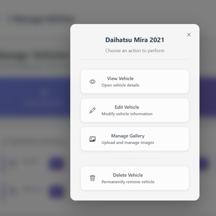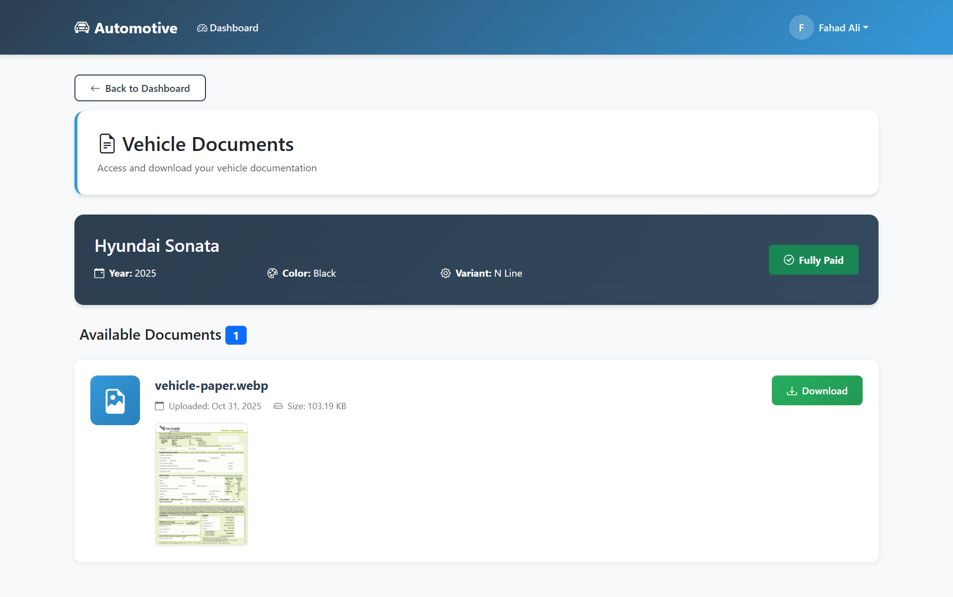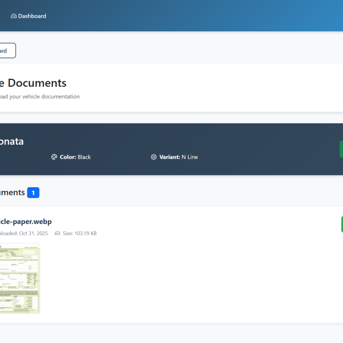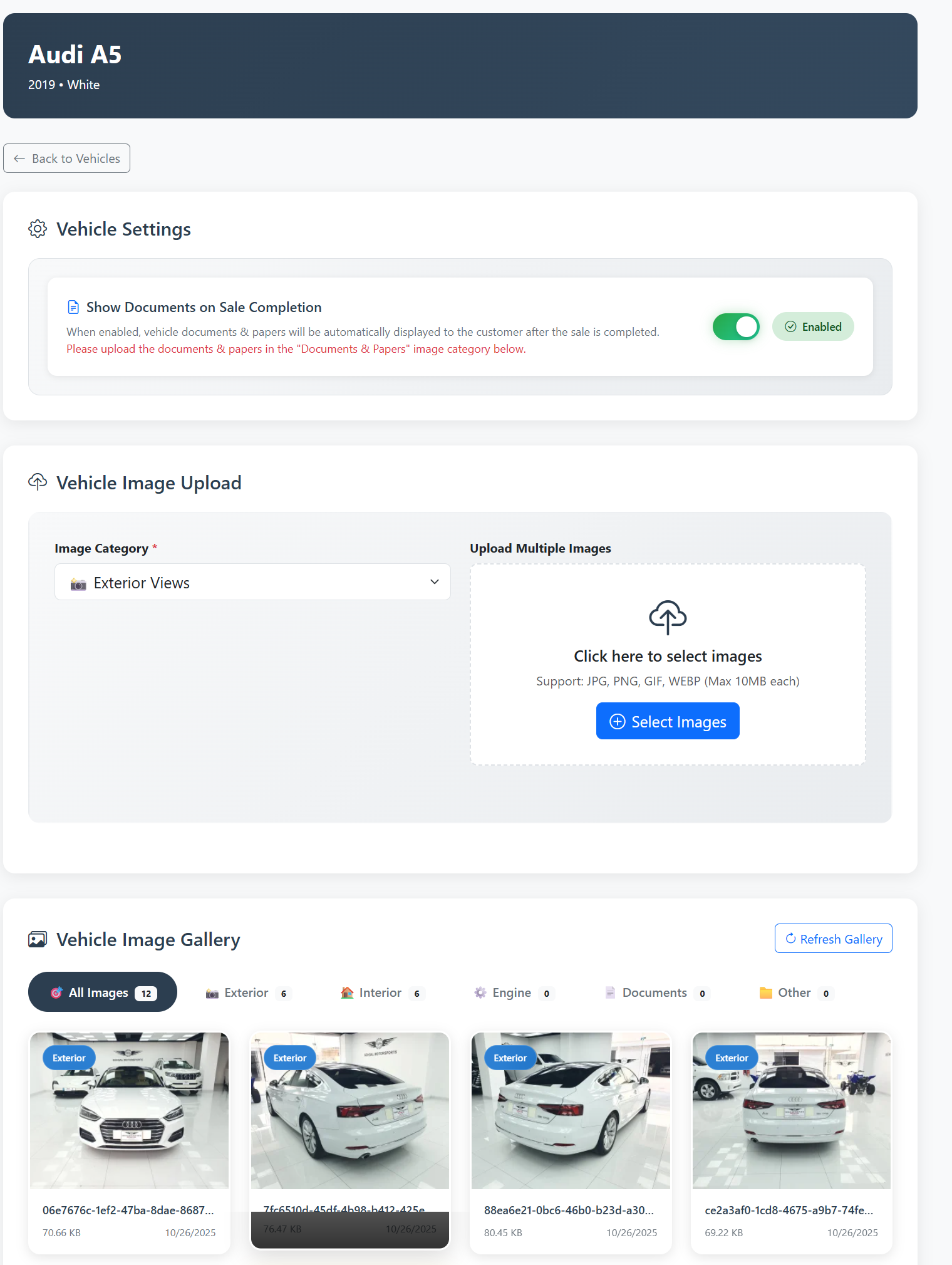 Securely upload and store important vehicle documents such as registration papers, invoices, and contracts. Documents are only visible to the customer after full payment or completed sale, ensuring data confidentiality.