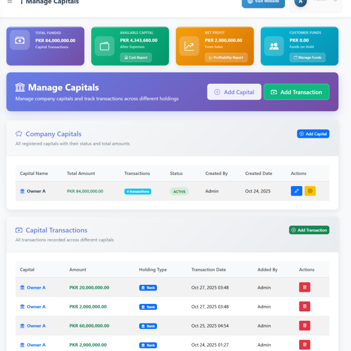 Keep full control of your business capital. Track investments made by the owner, monitor capital flow, and calculate ROI directly from your CRM.