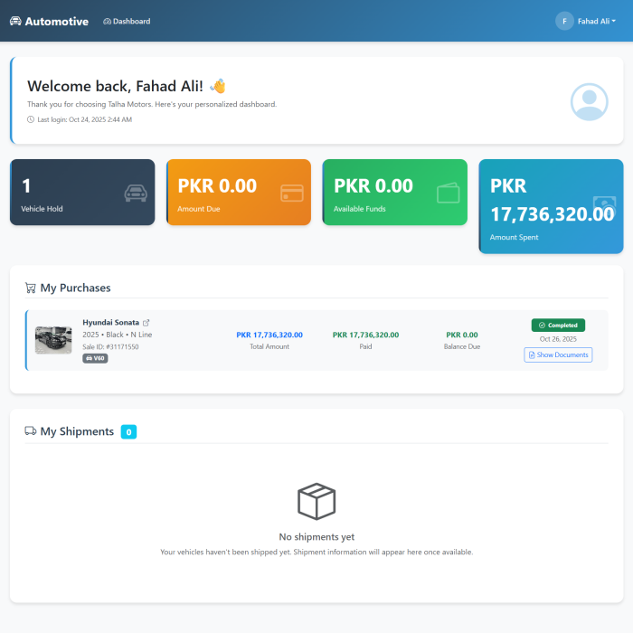 Every customer gets a personalized dashboard to view: Deposited funds, Purchased vehicles, Outstanding balance, Vehicle documents and papers. This gives your customers transparency and improves their experience.