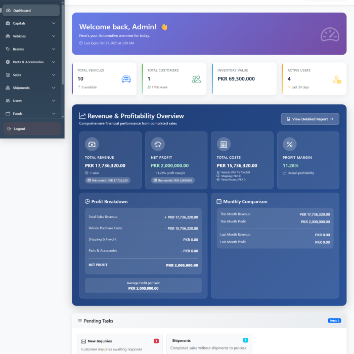 Get a complete system overview at a glance โ including revenue, profitability, total vehicles, active customers, pending balances, and more. Visual analytics make it easy to track your financial and operational performance in real time.