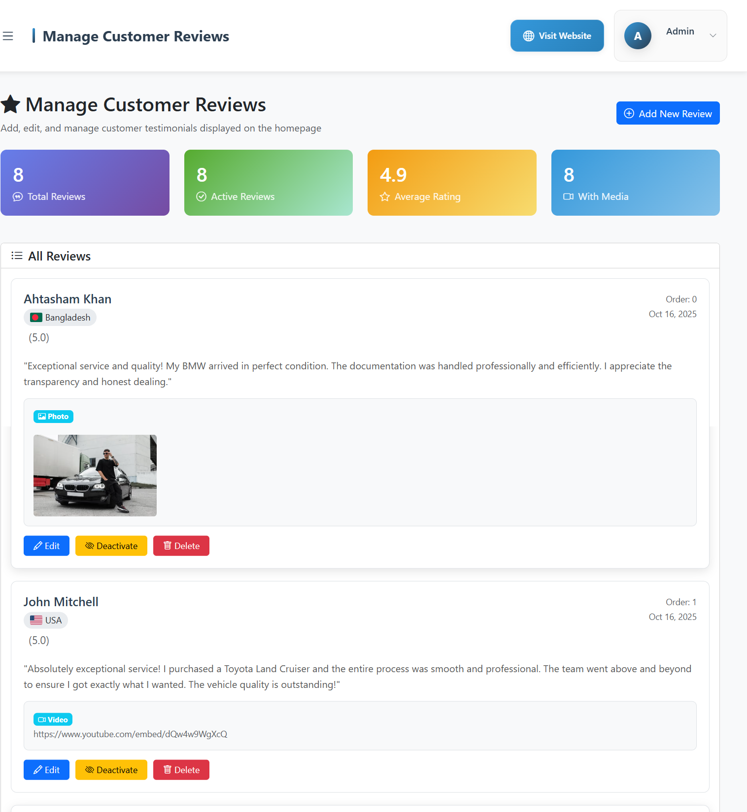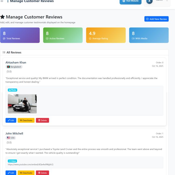 Collect and manage customer reviews from the frontend to build trust and enhance your dealershipโs online reputation.