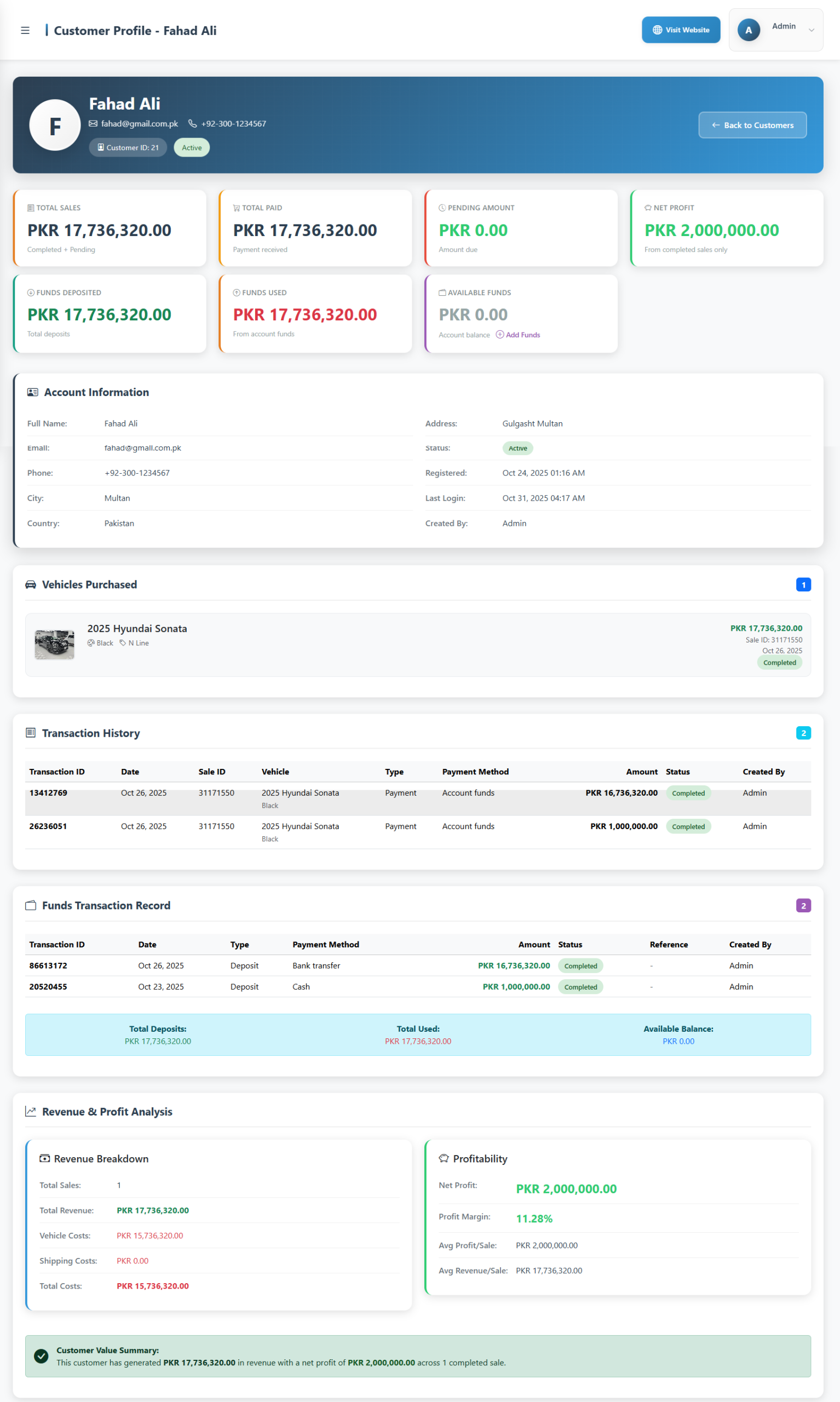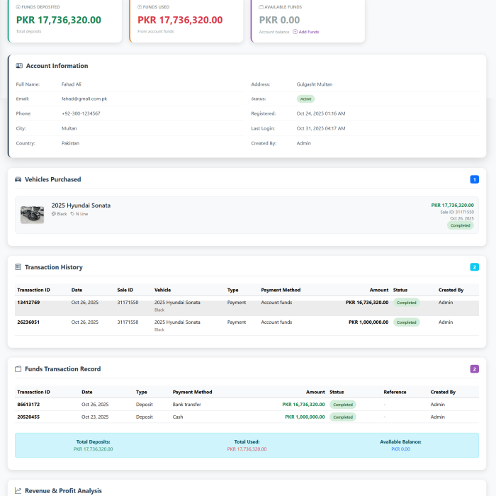 Access detailed customer profiles showing all business done with that customer, including: Total vehicles purchased, Funds deposited, Pending balances, Profit generated, Available funds on account. Everything is organized in one place for easy reference.
