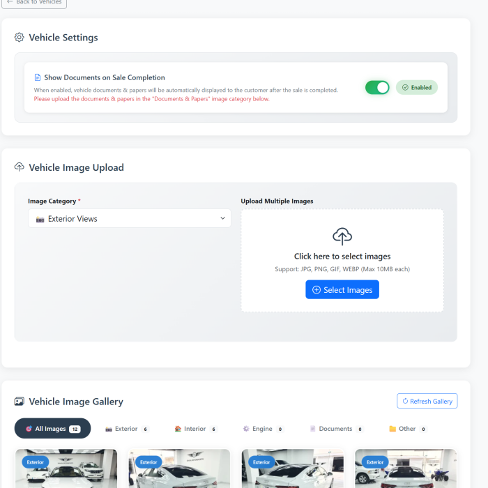 Upload and display high-quality images of your vehicles with multiple photo support. Make your listings more attractive and engaging for buyers.