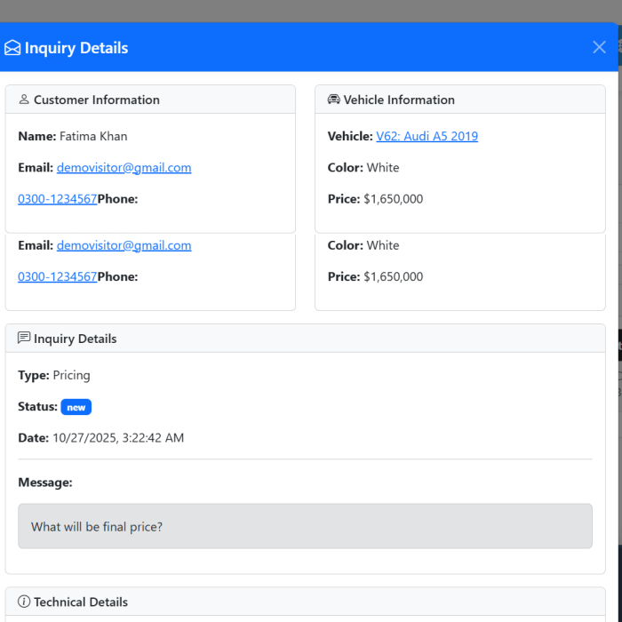 Manage inquiries from potential buyers directly from the frontend website. Assign leads to staff, follow up efficiently, and convert inquiries into successful sales.